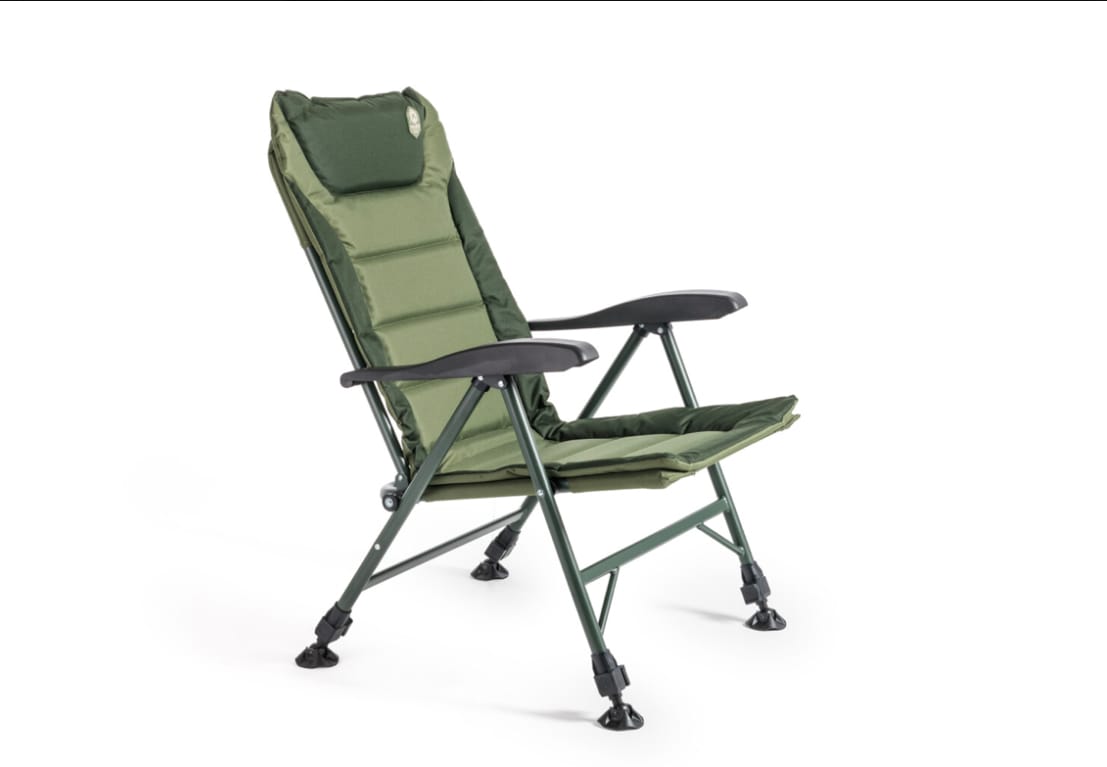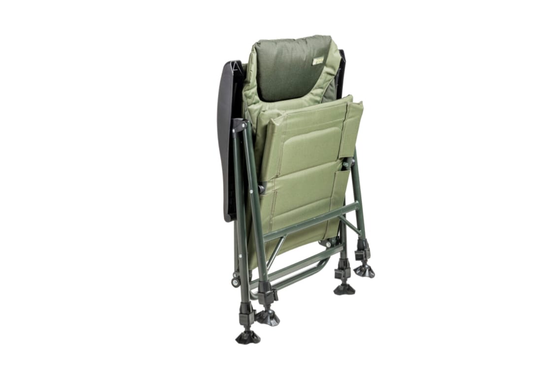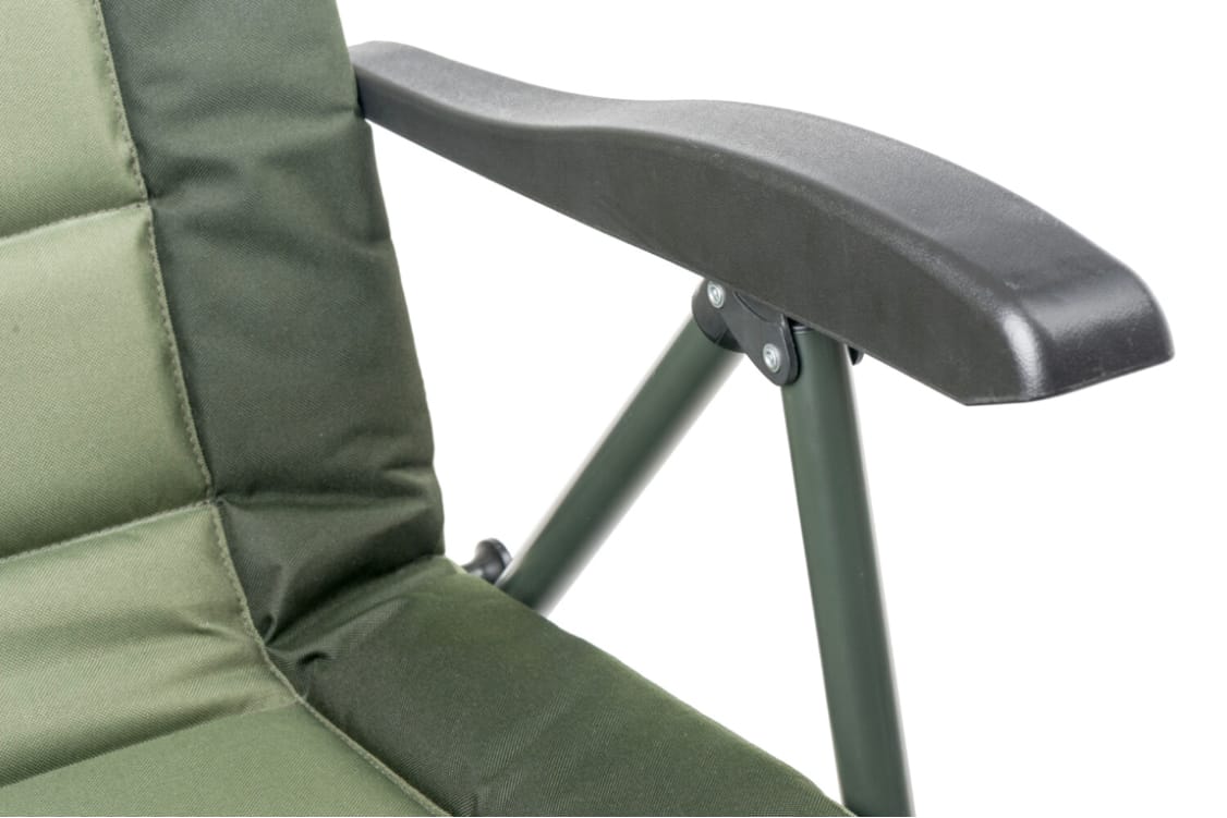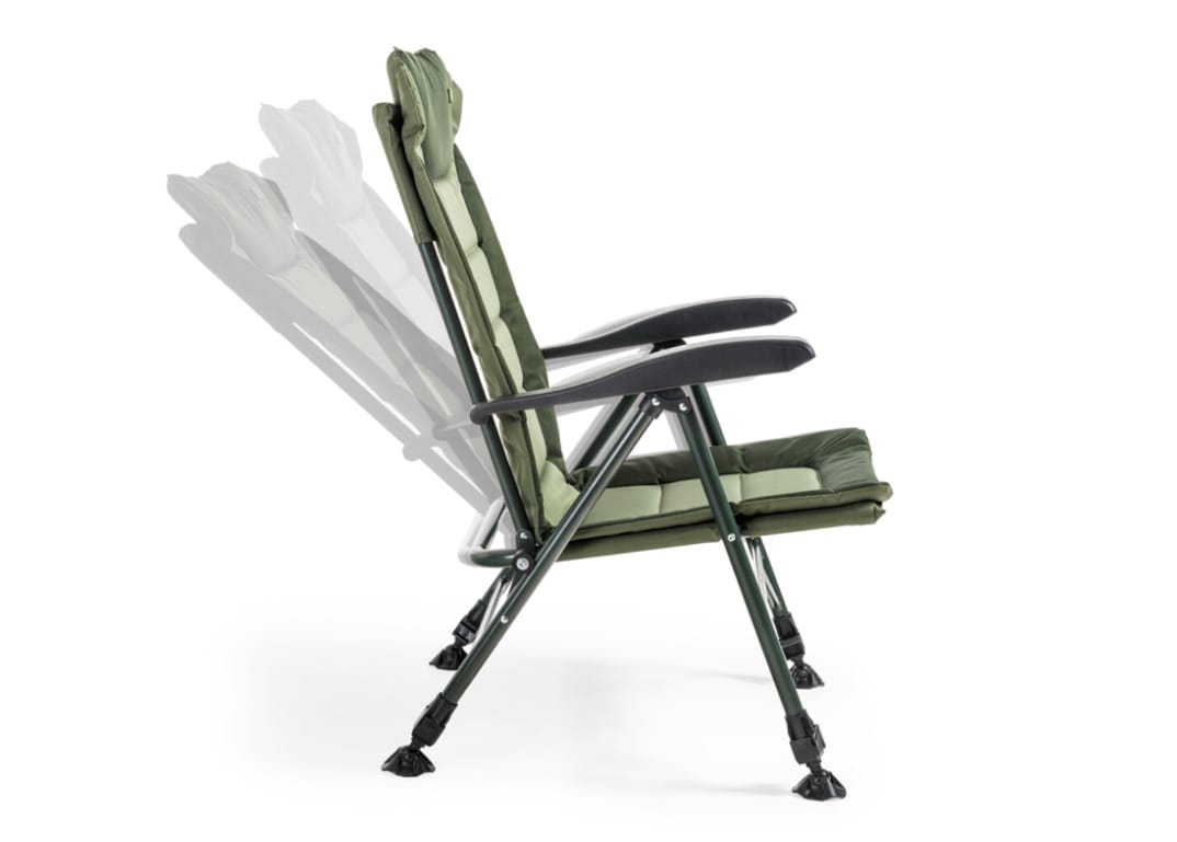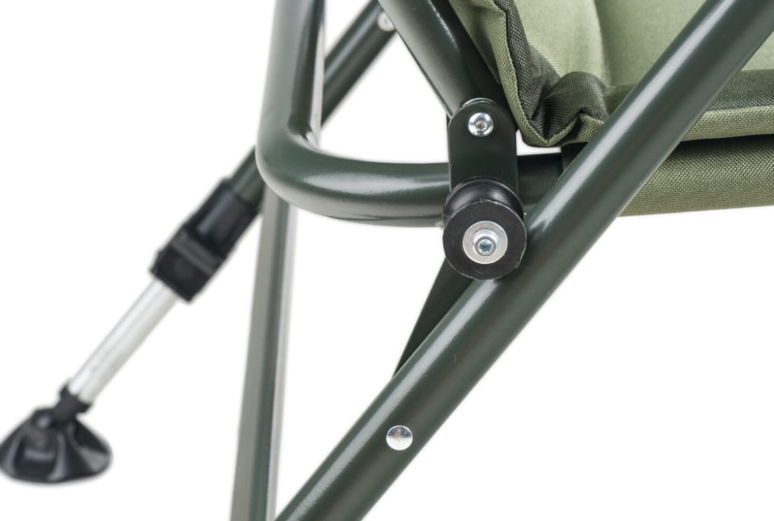 Компактна версія популярного крісла Comfort Quattro з надзвичайно міцним сталевим каркасом з вантажопідйомністю 175 кг. Положення спинки можна відрегулювати, піднявши підлокітники та нахиливши спинку в потрібне положення. Чохол матраца виготовлений з міцного та міцного нейлону P-POL 600D, який легко прати. Крісло оснащене новими замками для ніг, ексклюзивно розробленими Mivardi. Важіль блокування можна активувати наступним чином або простим натисканням рукою. На кожній нозі є якісна качаюча грязьова лапка.