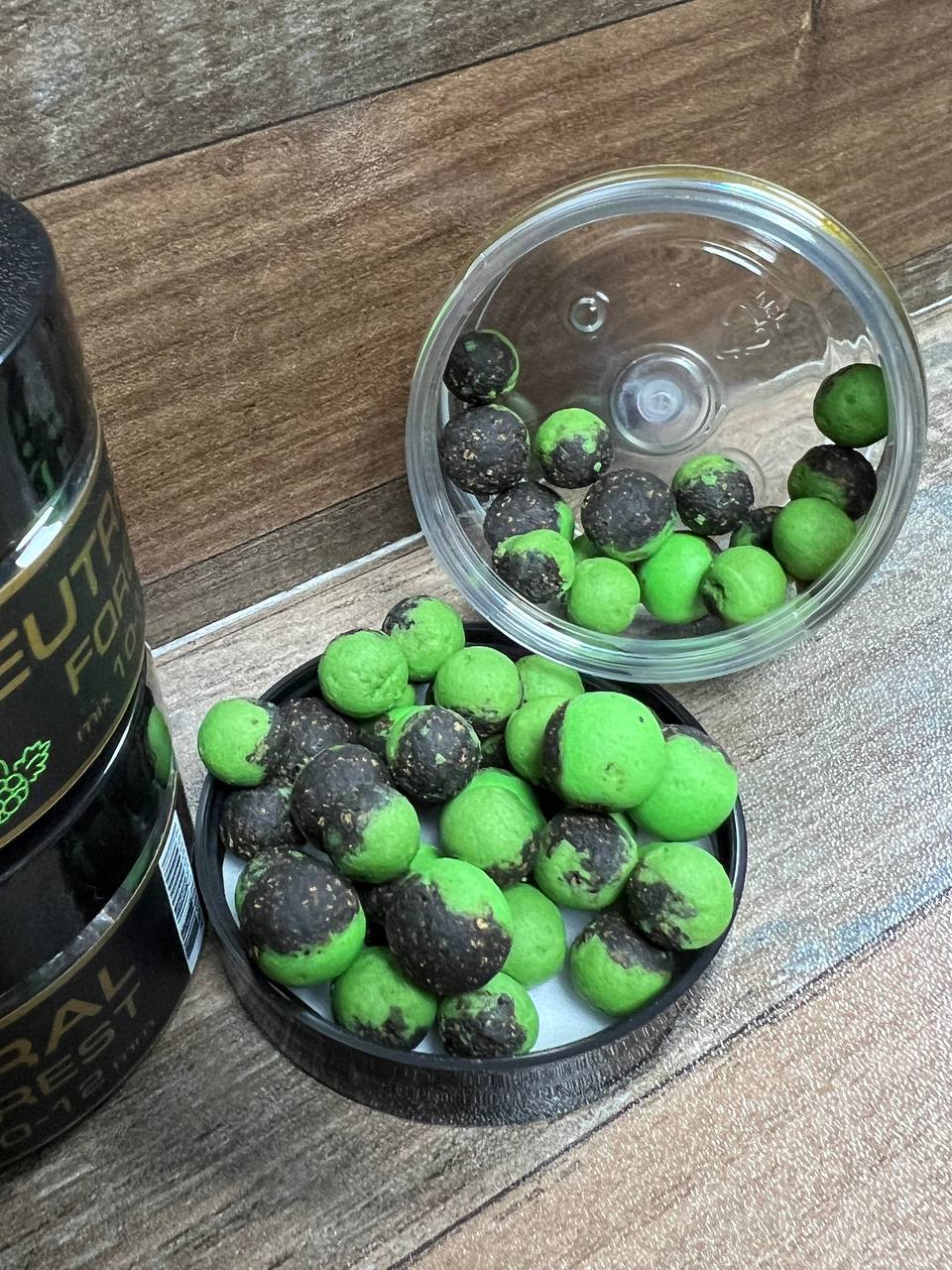 Колір насадки – одна половина вареного бойлу з корковою стружкою – темнокоричневий колір, інша половина поп-ап зелений травяний