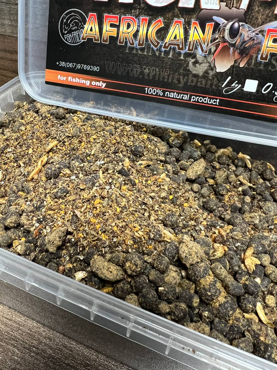 Склад – спеціально скатані 5,5 мм бойли на основі африканської мухи, гамарус в сквідовому гідролізі, муха грубого помолу, пеллетс кальмара та інші секретні інгредієнти